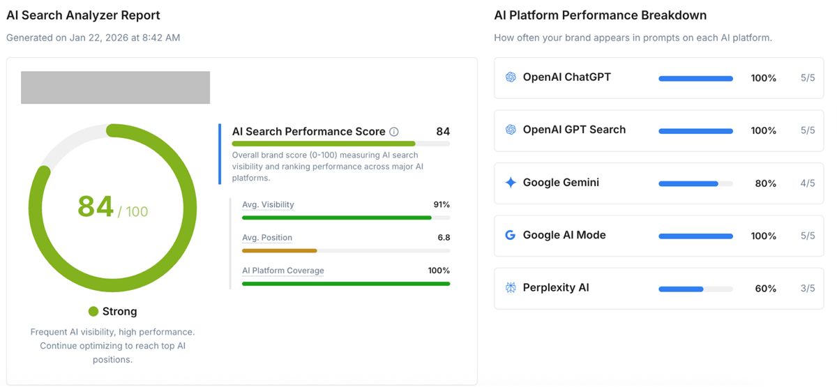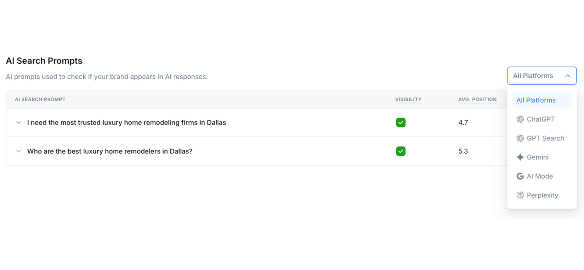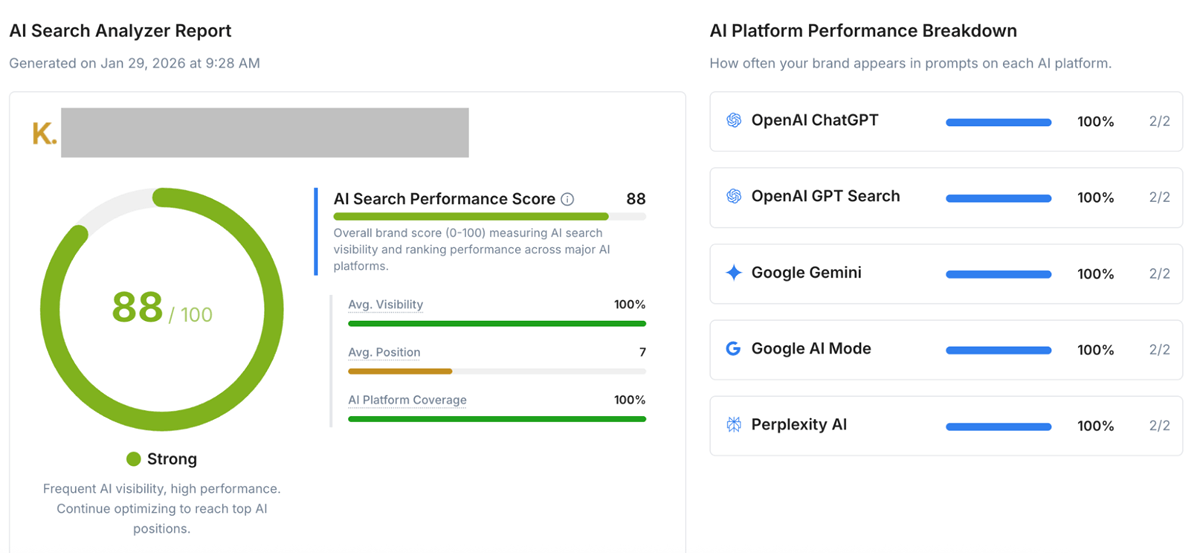 We have helped a Home Remodeling Company in Dallas obtain a strong AI visibility, with an AI Search Performance Score of 88/100. This means the brand shows up consistently across major AI platforms —averaging 100% visibility—and typically lands around position 7. They’re also fully covered everywhere we checked, appearing in all relevant prompts like "Who are the best luxury home remodelers in Dallas?" on ChatGPT, GPT Search, Google Gemini, Google AI Mode, and Perplexity, with a clear opportunity to keep optimizing and move into the very top spots.