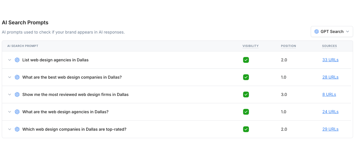 This Web Design Company in Dallas is absolutely crushing it in AI search, with a 95/100 AI Search Performance Score. For the prompt “What are the best web design companies in Dallas?”, they show up almost everywhere (97% average visibility) and rank near the top with an average position of 2.8. They have full coverage across the major platforms—ChatGPT, GPT Search, Google Gemini, and Google AI Mode—with just a small dip on Perplexity (80% visibility). The main move now is maintenance: keep up ongoing AI SEO and shore up Perplexity to stay dominant.